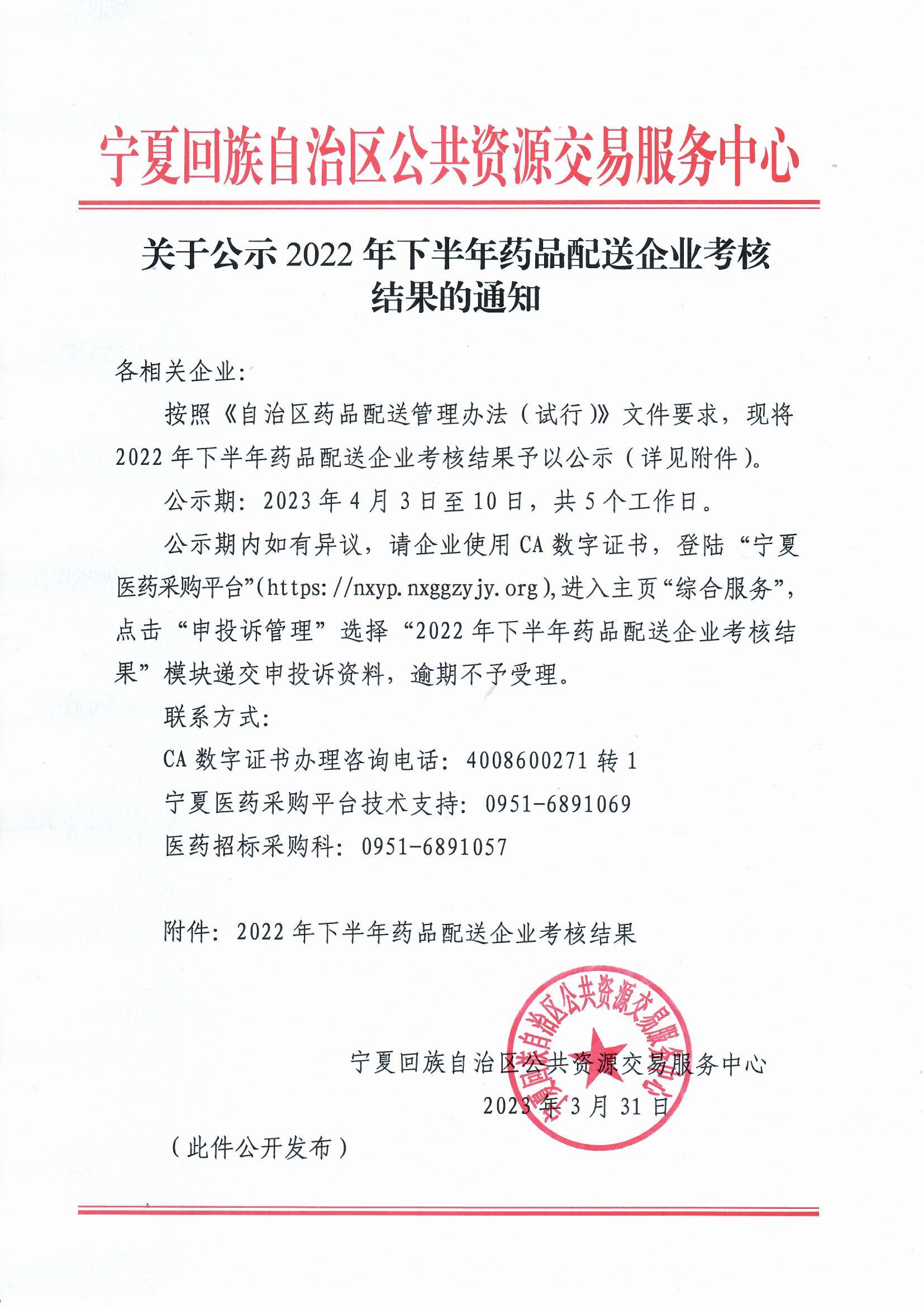 按照《自治区药品配送管理办法(试行)》文件要求,现将2022年下半年药品配送企业考核结果予以公示(详见附件)。公示期:2023年4月3日至10日,共5个工作日。公示期内如有异议,请企业使用CA数字证书,登陆"宁夏医药采购平台"(https://nxyp.nxggzyjy.org),进入主页"综合服务",点击“申投诉管理”选择“2022年下半年药品配送企业考核结果”模块递交申投诉资料,逾期不予受理。