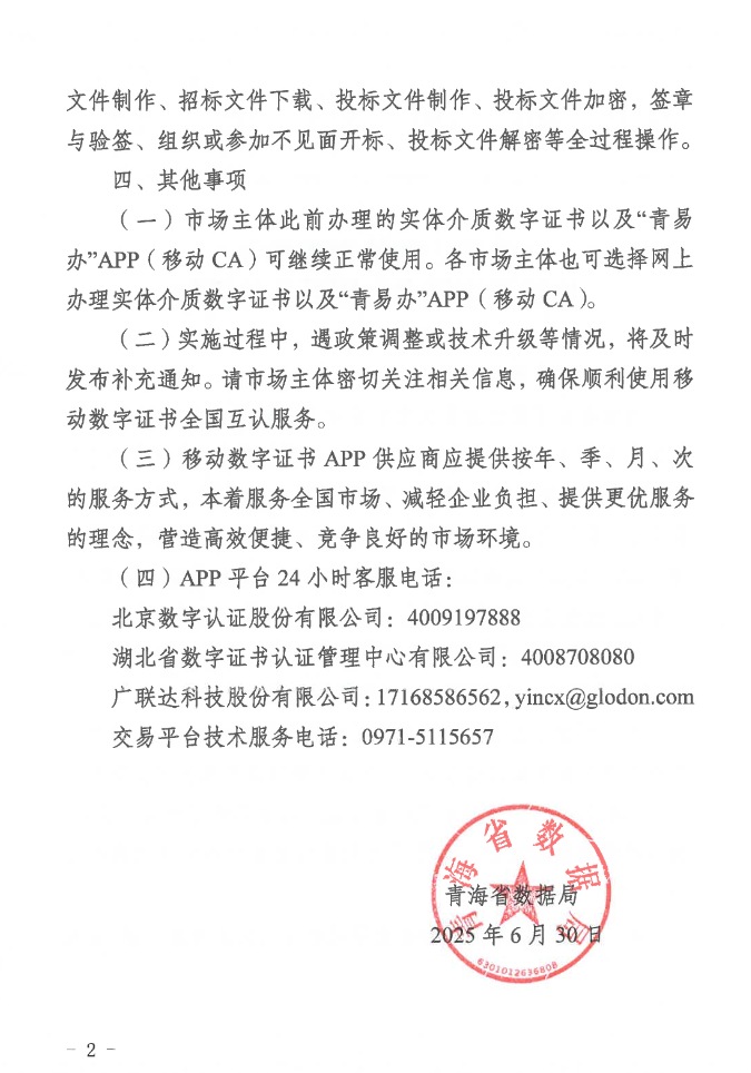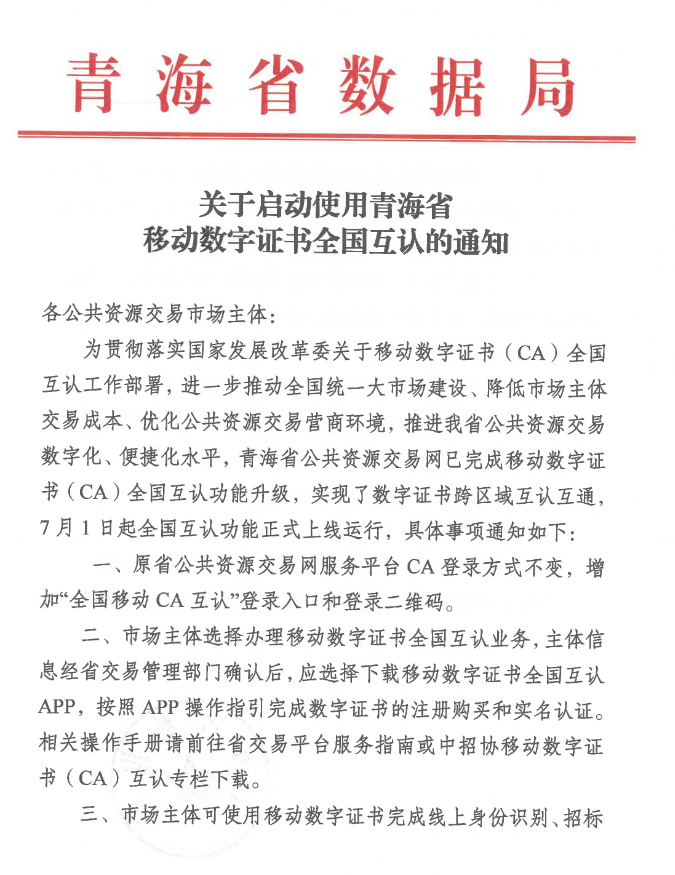 【青海】关于启动使用青海省移动数字证书全国互认的通知