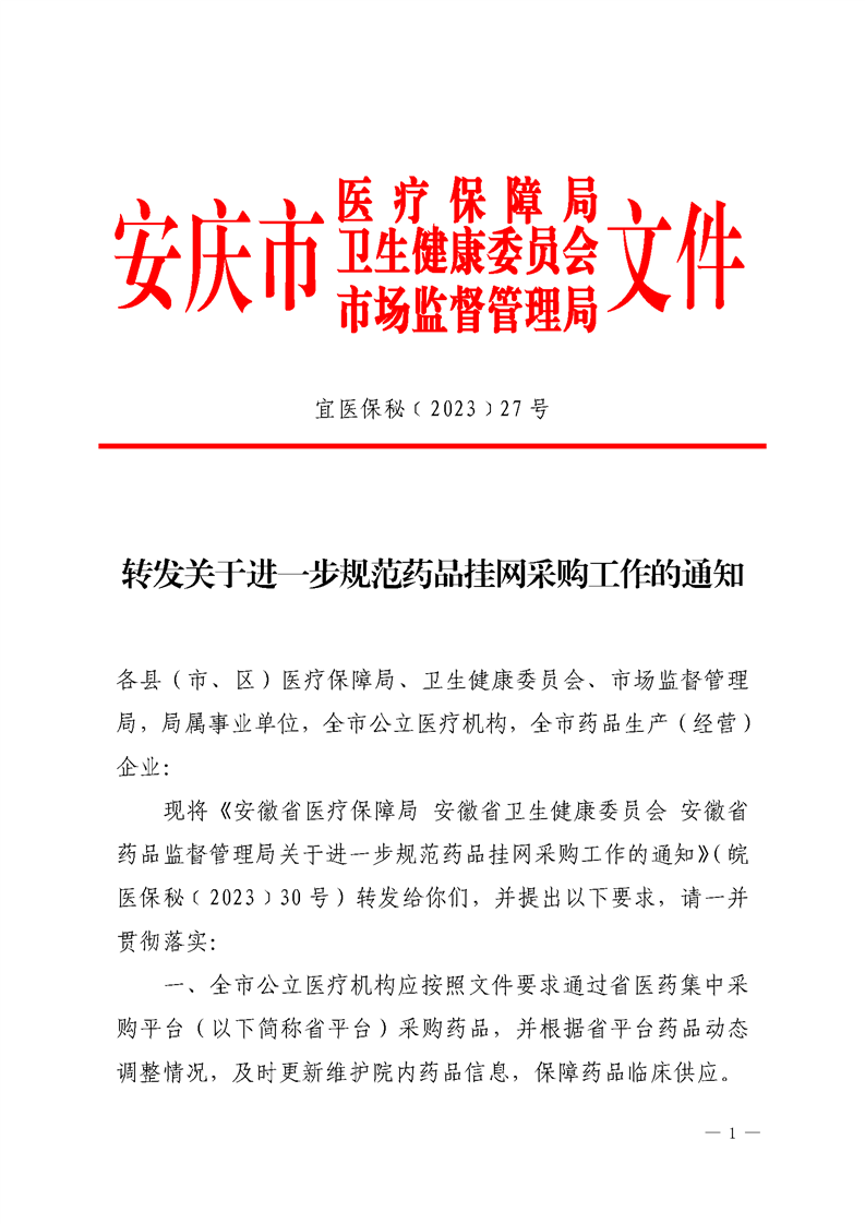 现将《安徽省医疗保障局安徽省卫生健康委员会安徽省药品监督管理局关于进一步规范药品挂网采购工作的通知》(皖医保秘(2023)30号)转发给你们,并提出以下要求,请一并贯彻落实: