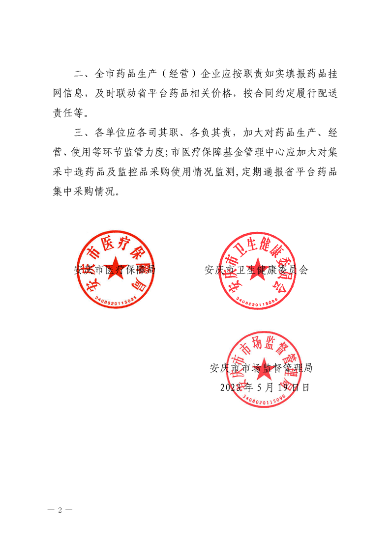 三、各单位应各司其职、各负其责,加大对药品生产、经营、使用等环节监管力度;市医疗保障基金管理中心应加大对集采中选药品及监控品采购使用情况监测,定期通报省平台药品集中采购情况。