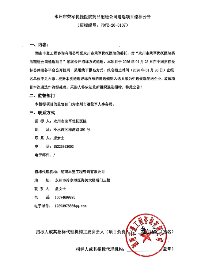 【永州市荣军优抚医院】湖南省永州市荣军优抚医院药品配送公司遴选项目流标公告