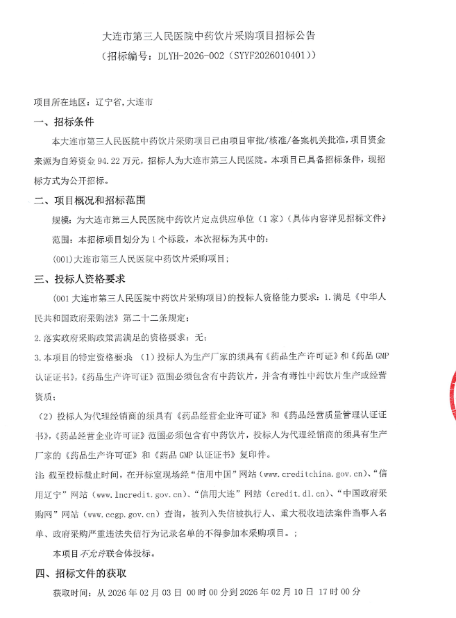 【大连市第三人民医院】辽宁省大连市第三人民医院中药饮片采购项目招标公告