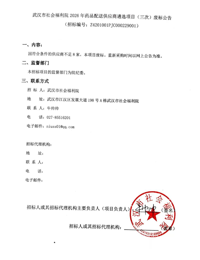 【武汉市社会福利院】湖北省武汉市社会福利院2026年药品配送供应商遴选项目(三次)废标公告
