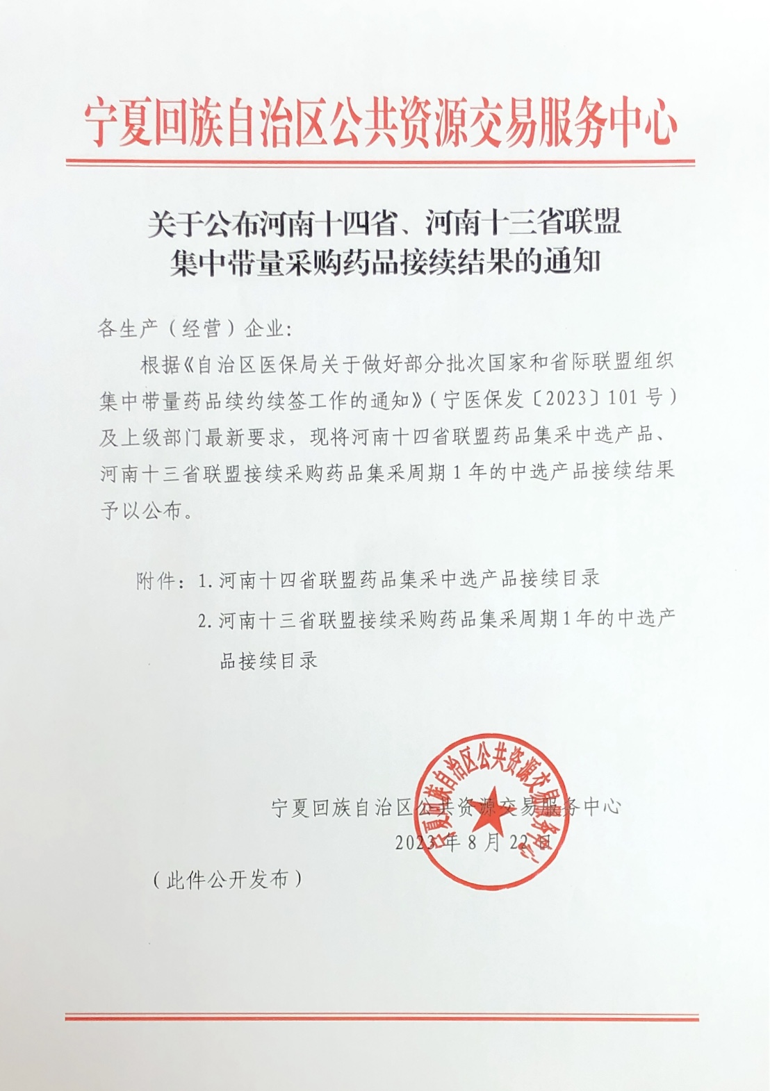 【宁夏】关于公布河南十四省、河南十三省联盟集中带量采购药品接续结果的通知