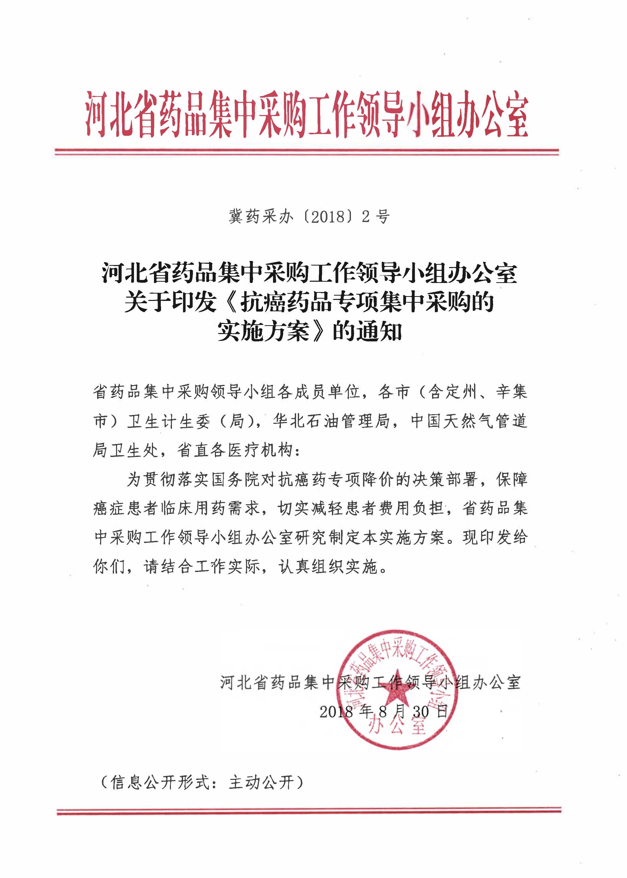 河北省药品集中采购工作领导小组办公室关于印发《抗癌药品专项集中采购的实施方案》的通知