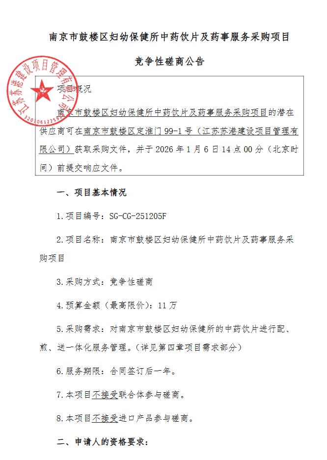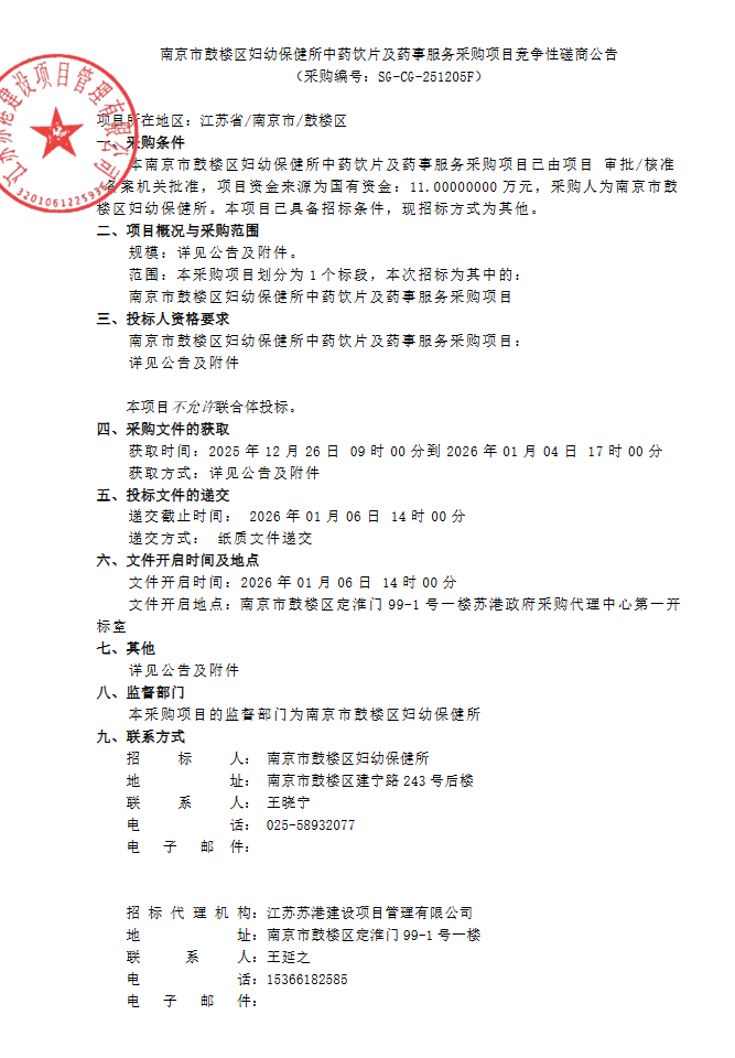 【南京市鼓楼区妇幼保健所】江苏省南京市鼓楼区妇幼保健所中药饮片及药事服务采购项目竞争性磋商公告