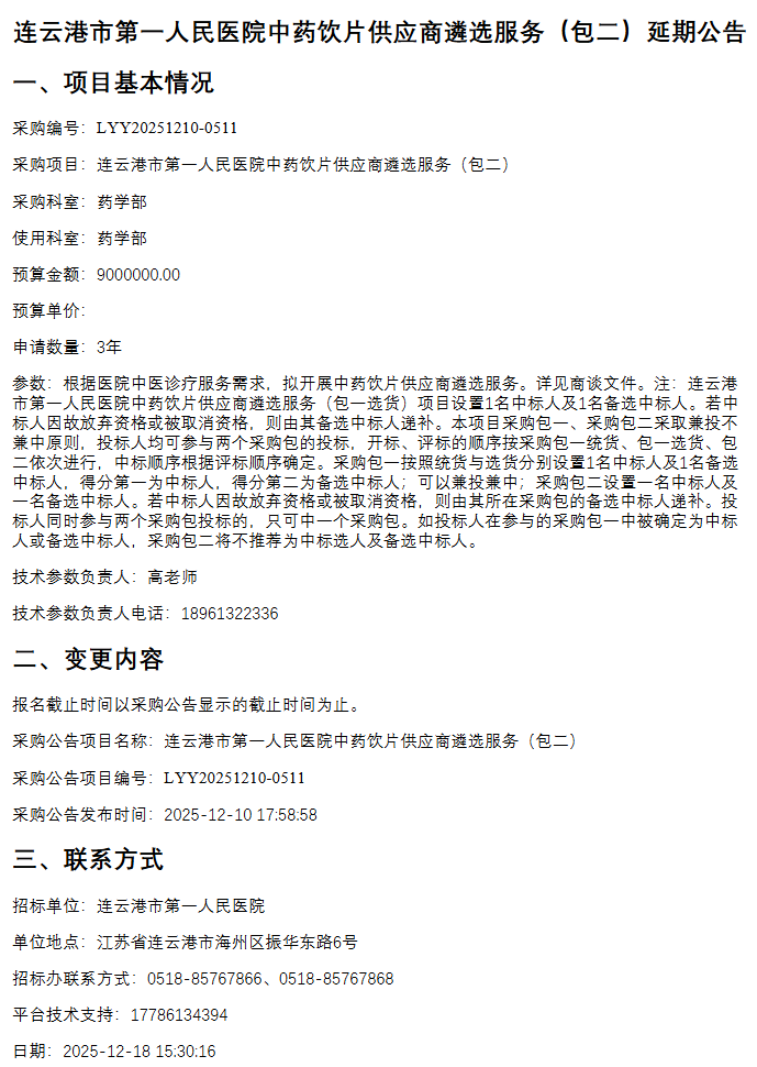 【连云港市第一人民医院】江苏省连云港市第一人民医院中药饮片供应商遴选服务(包二)延期公告