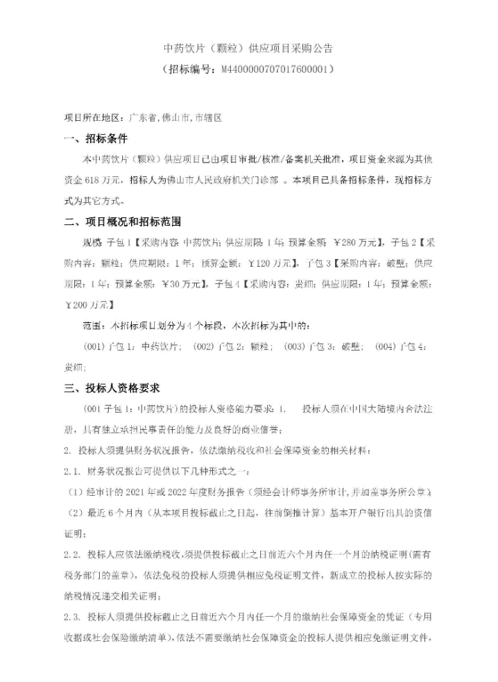 【佛山市人民政府门诊部】广东省佛山市人民政府门诊部中药饮片(颗粒)供应项目采购公告