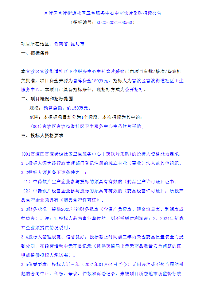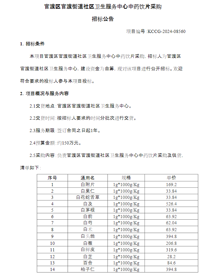 【昆明市官渡街道社区卫生服务中心】云南省昆明市官渡街道社区卫生服务中心中药饮片采购招标公告