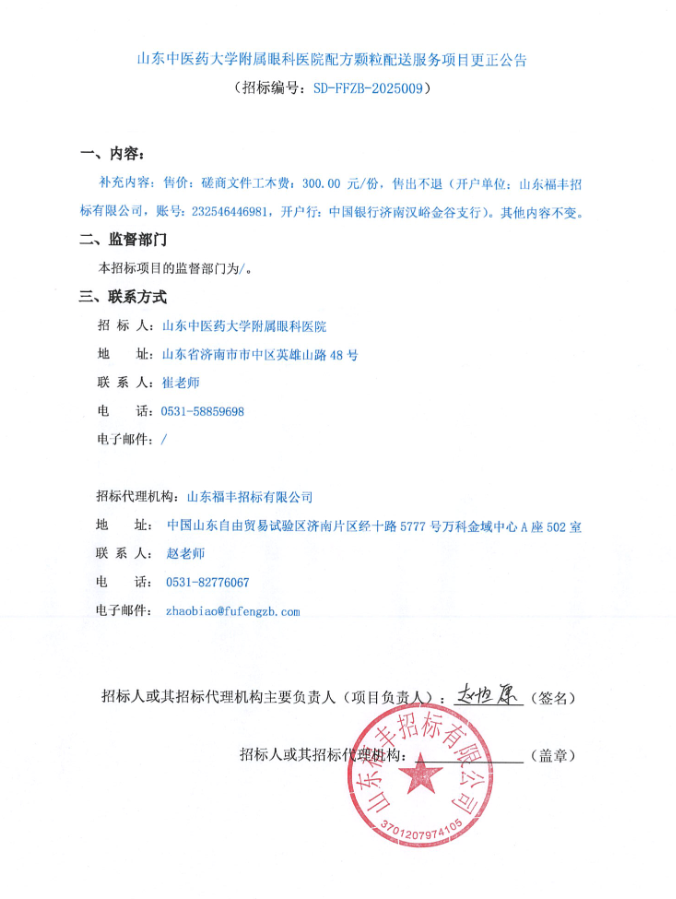 【山东中医药大学附属眼科医院】山东中医药大学附属眼科医院配方颗粒配送服务项目更正公告