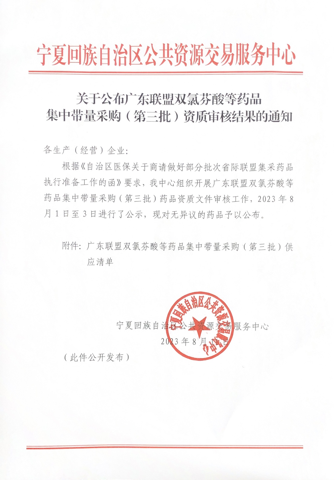 【宁夏】关于公布广东联盟双氯芬酸等药品集中带量采购(第三批)资质审核结果的通知