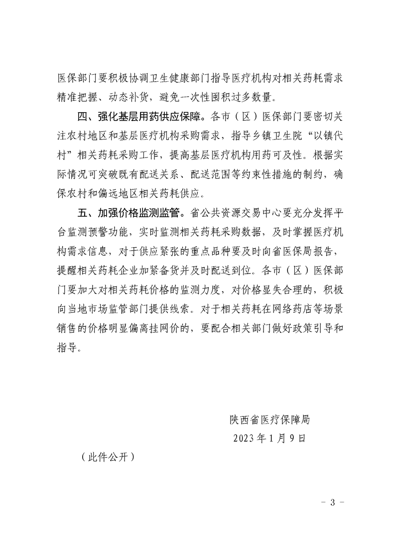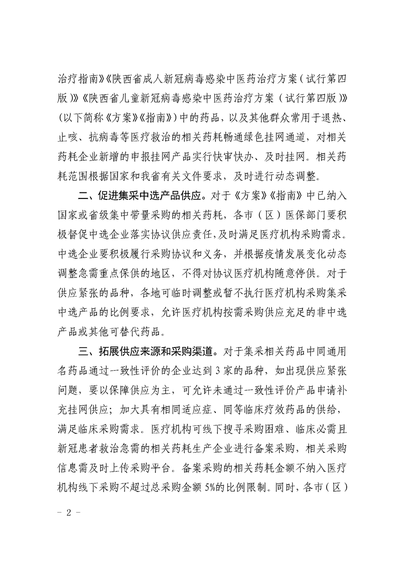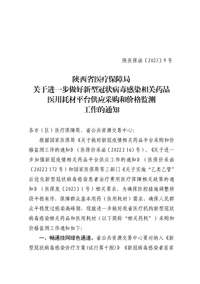 各市(区)医疗保障局,省公共资源交易中心: 根据国家医保局《关于做好新冠疫情相关药品平台采购和价 格监测工作的通知》(医保价采函〔2022〕163号)、《关于进一 步加强新冠疫情相关药品平台供应工作的通知》(医保价采函 〔2022〕172号)和国家医保局等三部门《关于实施“乙类乙管” 后优化新型冠状病毒感染患者治疗费用医疗保障相关政策的通 知》(医保发〔2023〕1号)相关要求,为确保防控措施调整转 段平稳有序,保障群众基本用药(医用耗材)需求,确保人民群众平稳度过感染高峰期,现就进一步做好我省医疗机构新型冠状 病毒感染相关药品和医用耗材(以下简称“相关药耗”)采购和格监测工作通知如下: 一、畅通挂网绿色通道。 省公共资源交易中心要对纳入《新型冠状病毒感染诊疗方案(试行第十版)》 《新冠病毒感染者居家治疗指南》《陕西省成人新冠病毒感染中医药治疗方案(试行第四 版)》《陕西省儿童新冠病毒感染中医药治疗方案(试行第四版)》 (以下简称《方案》《指南》)中的药品,以及其他群众常用于退热、 止咳、抗病毒等医疗救治的相关药耗畅通绿色挂网通道,对相关 药耗企业新增的申报挂网产品实行快审快办、及时挂网。相关药耗范围根据国家和我省有关文件要求,及时进行动态调整。 二、促进集采中选产品供应。 对于《方案》《指南》中已纳入 国家或省级集中带量采购的相关药耗,各市(区)医保部门要积 极督促中选企业落实协议供应责任,及时满足医疗机构采购需求。 中选企业要积极履行采购协议和义务,并根据疫情发展变化动态 调整急需重点保供的地区,不得对协议医疗机构随意停供。对于 供应紧张的品种,各地可临时调整或暂不执行医疗机构采购集采 中选产品的比例要求,允许医疗机构按需采购供应充足的非中选产品或其他可替代药品。 三、拓展供应来源和采购渠道。 对于集采相关药品中同通用 名药品通过一致性评价的企业达到3家的品种,如出现供应紧张 问题,要以保障供应为主,可允许未通过一致性评价产品申请补充挂网供应;加大具有相同适应症、同等临床疗效药品的供给,满足临床采购需求。医疗机构可线下搜寻采购困难、临床必需且新冠患者救治急需的相关药耗生产企业进行备案采购,相关采购信息需及时上传采购平台。备案采购的相关药耗金额不纳入医疗机构线下采购不超过总采购金额5%的比例限制。同时,各市(区)医保部门要积极协调卫生健康部门指导医疗机构对相关药耗需求精准把握、动态补货,避免一次性围积过多数量。 四、 强化基层用药供应保障。 各市(区)医保部门要密切关 注农村地区和基层医疗机构采购需求,指导乡镇卫生院“以镇代 村”相关药耗采购工作,提高基层医疗机构用药可及性。根据实 际情况可突破既有配送关系、配送范围等约束性措施的制约,确保农村和偏远地区相关药耗供应。 五、 加强价格监测监管。 省公共资源交易中心要充分发挥平 台监测预警功能,实时监测相关药耗采购数据,及时掌握医疗机 构需求信息,对于供应紧张的重点品种要及时向省医保局报告, 提醒相关药耗企业加紧备货并及时配送到位。各市(区)医保部 门要加大对相关药耗价格的监测力度,对价格显失合理的,积极向当地市场监管部门提供线索。对于相关药耗在网络药店等场景销售的价格明显偏离挂网价的,要配合相关部门做好政策引导和指导。