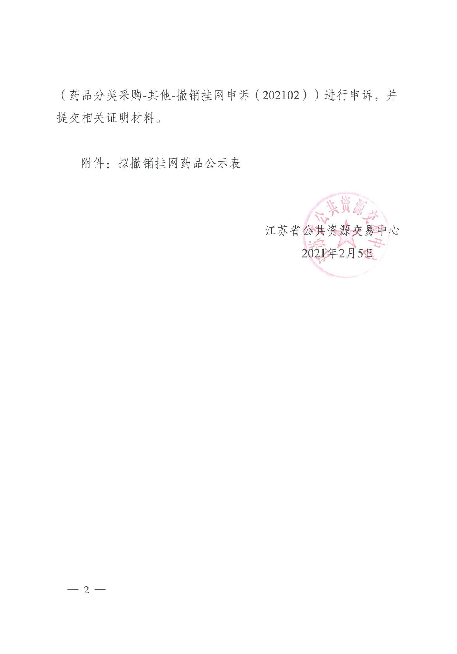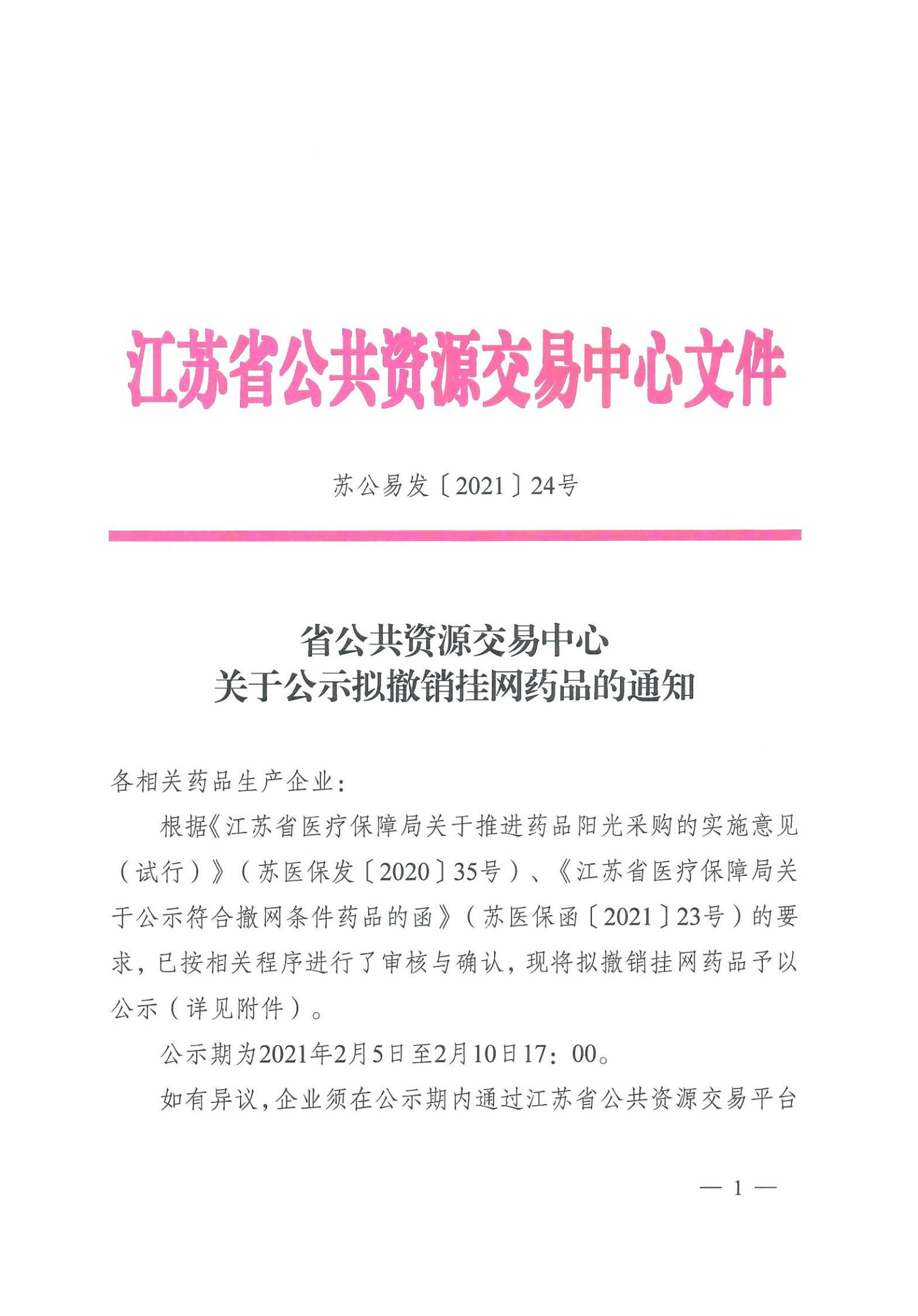 【江苏】2021年江苏省公共资源交易中心关于公示拟撤销挂网药品的通知 苏公易发[2021]24号