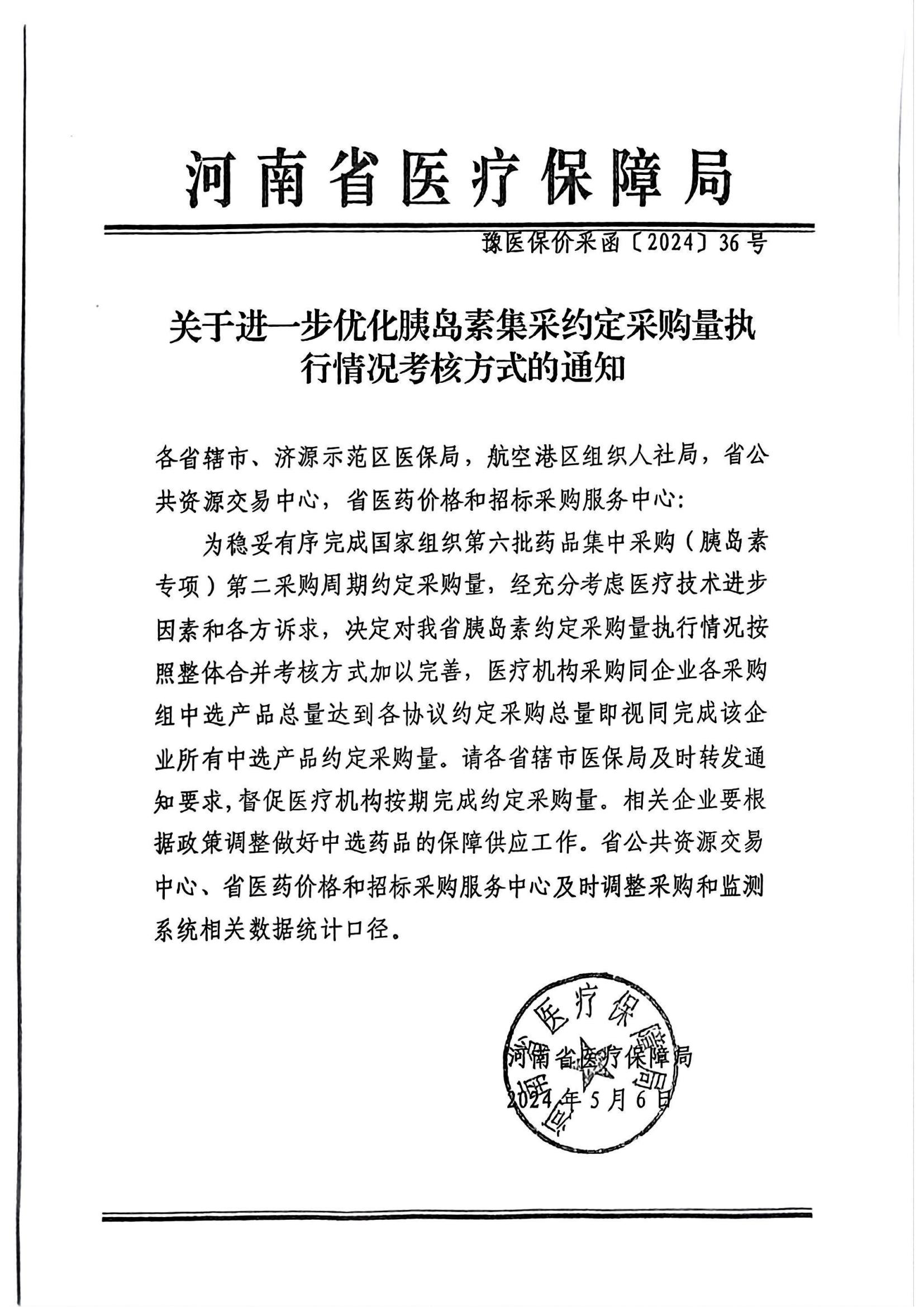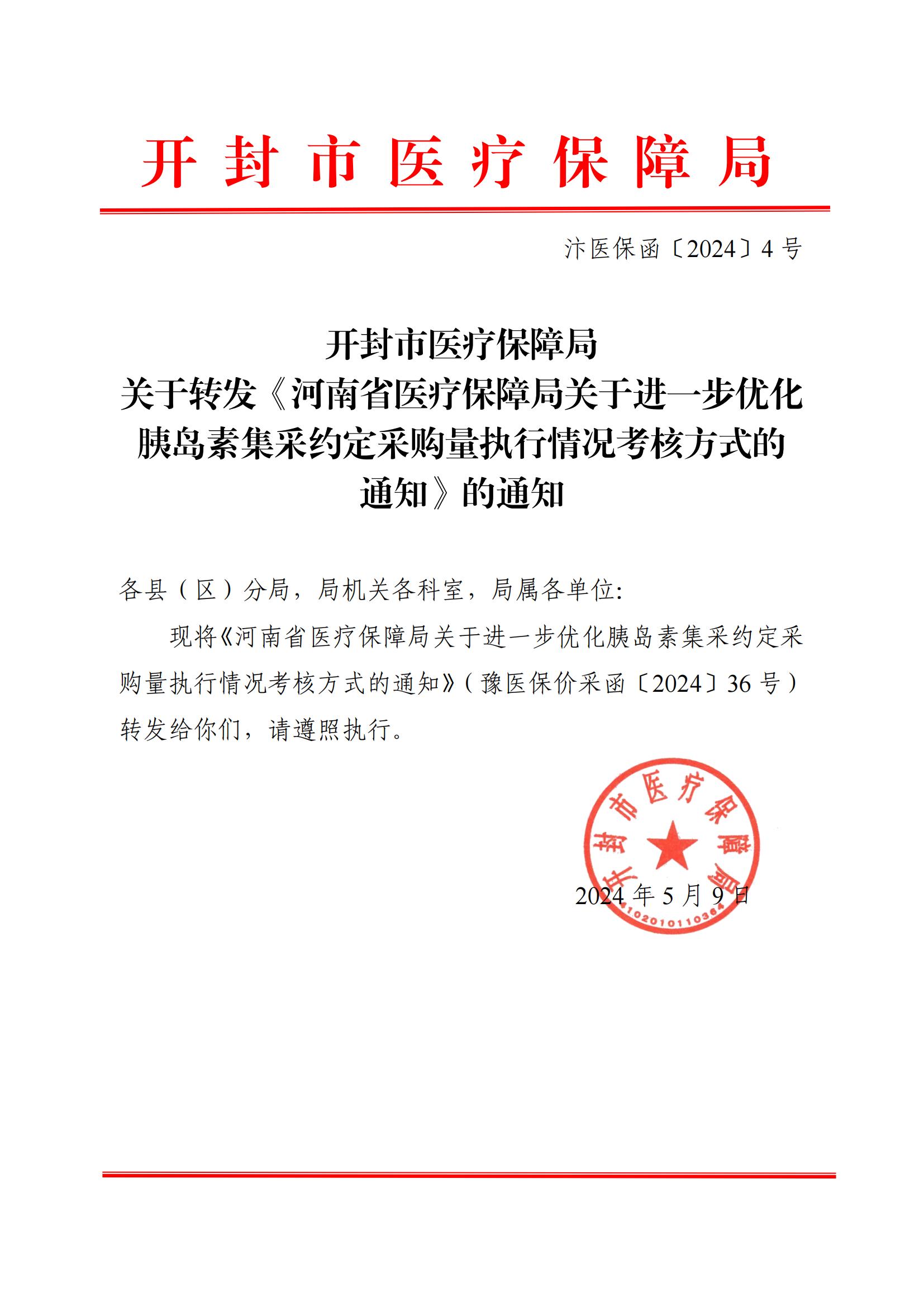 【开封】汴医保函2024 4关于转发《河南省医疗保障局关于进一步优化胰岛素集采约定采购量执行情况考核方式的通知》的通知