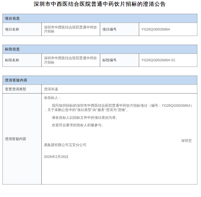【深圳市中西医结合医院】广东省深圳市中西医结合医院普通中药饮片招标的澄清公告