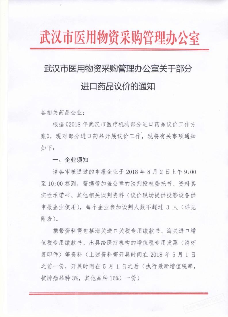 【武汉】湖北省武汉市医用物资采购管理办公室关于部分进口药品议价工作的通知