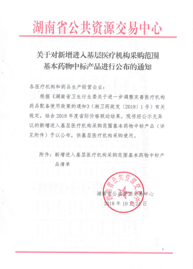 【湖南】关于对新增进入基层医疗机构采购范围基本药物中标产品进行公布的通知