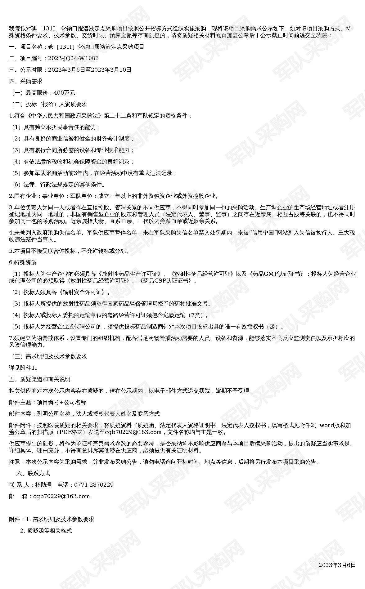 【南宁市某医院】军队采购网南宁市某医院碘[131I]化钠口服溶液定点采购项目需求公示(项目编号:2023-JQ24-W1002)