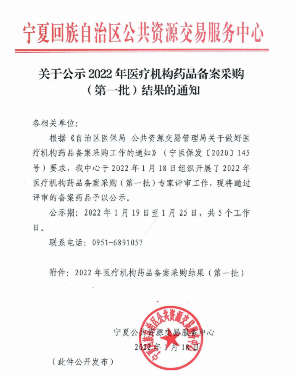 【宁夏】宁夏回族自治区关于公示2022年医疗机构药品备案采购(第一批)结果的通知