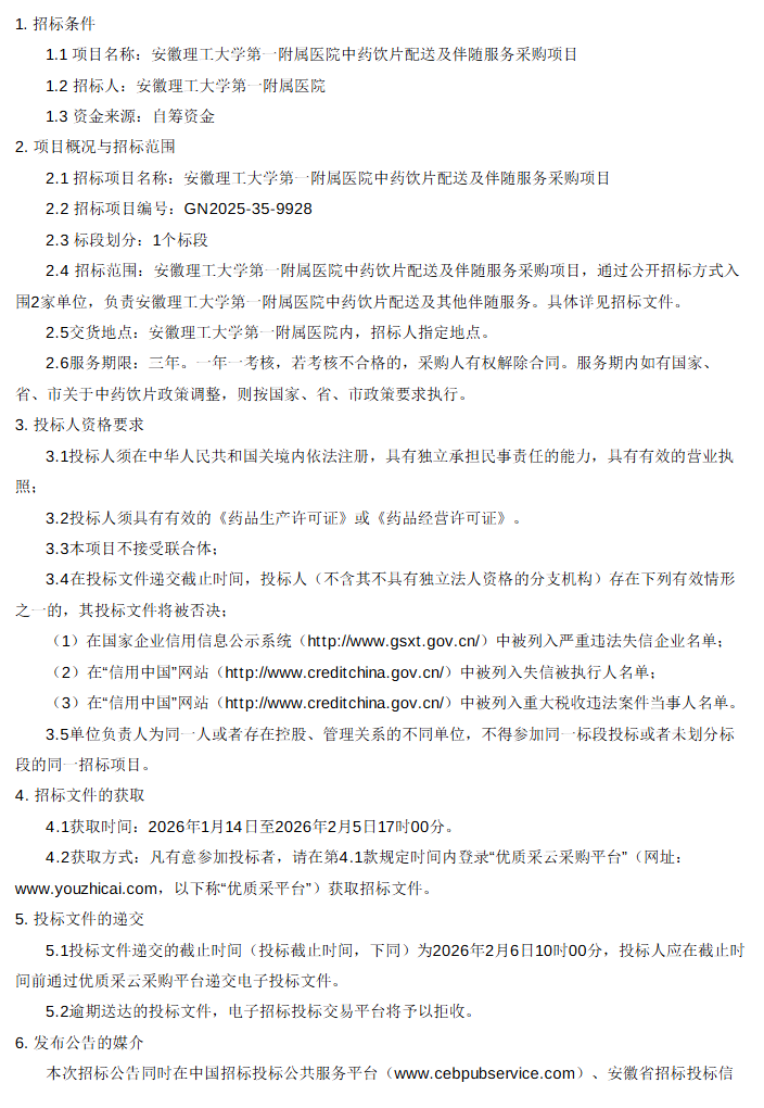 【安徽理工大学第一附属医院】安徽理工大学第一附属医院中药饮片配送及伴随服务采购项目招标公告