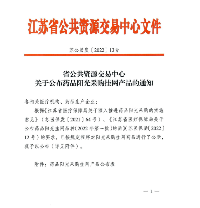 【江苏】江苏省公共资源交易中心关于公布药品阳光采购挂网产品的通知(20220118)