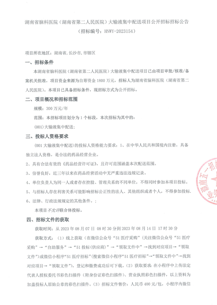 【湖南省脑科医院】湖南省脑科医院(湖南省第二人民医院)大输液集中配送项目公开招标招标公告