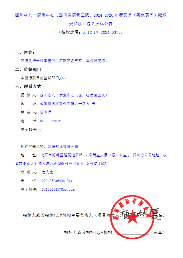 【四川省八一康复中心】四川省八一康复中心(四川省康复医院)2024-2026年度药品(其他药品)配送采购项目包2废标公告