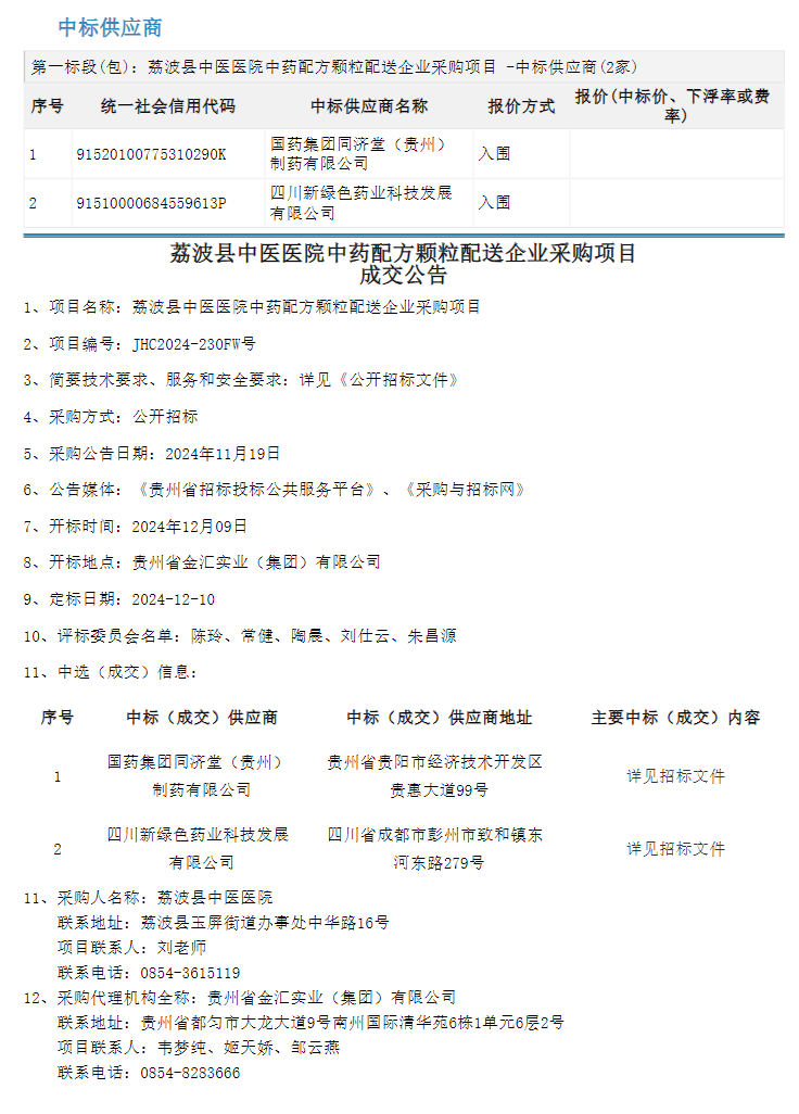 【黔南布依族苗族自治州荔波县中医医院】贵州省黔南布依族苗族自治州荔波县中医医院中药配方颗粒配送企业采购项目成交公告