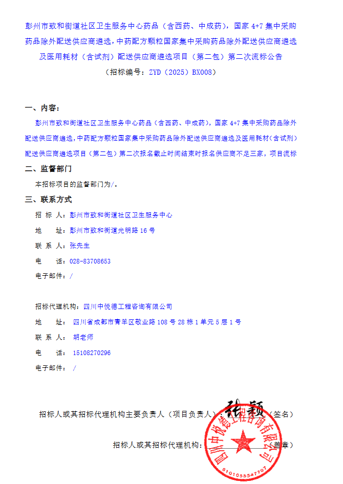 【成都市彭州市致和街道社区卫生服务中心】四川省彭州市致和街道社区卫生服务中心药品(含西药、中成药),国家4+7集中采购药品除外配送供应商遴选,中药配方颗粒国家集中采购药品除外配送供应商遴选及医用耗材(含试剂)配送供应商遴选项目(第二包)第二次流标公告