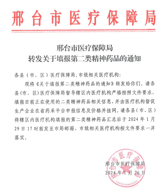 【邢台】邢台市医疗保障局转发关于填报第二类精神药品的通知