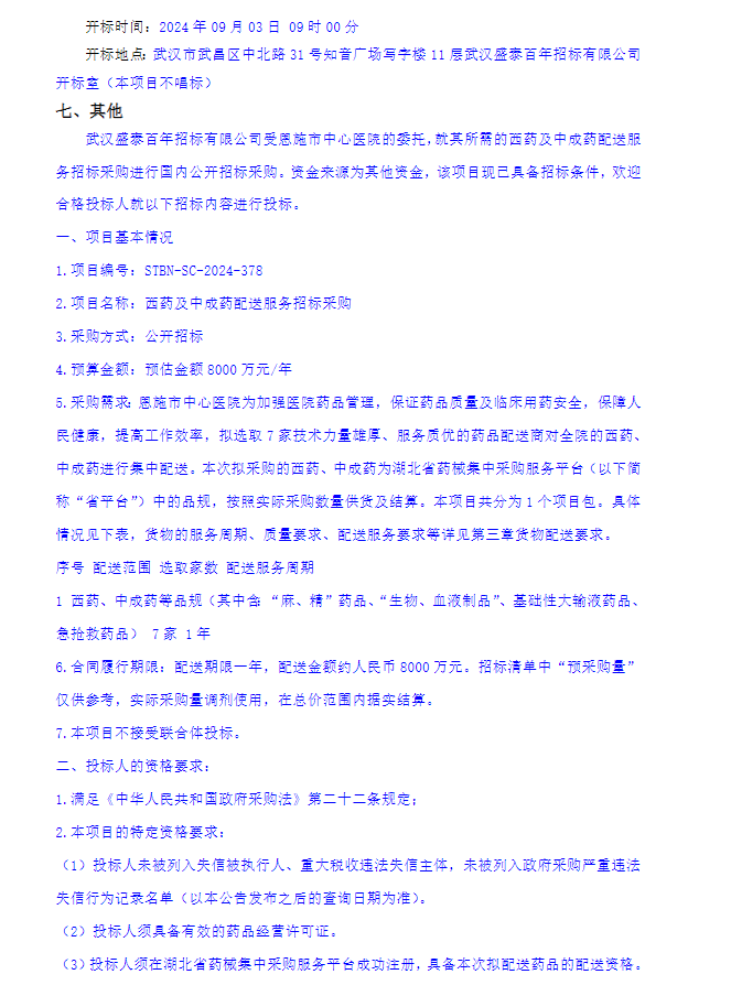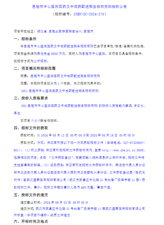 【恩施市中心医院】湖北省恩施土家族苗族自治州恩施市中心医院西药及中成药配送服务招标采购招标公告