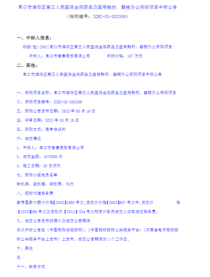 【周口市淮阳区第三人民医院】河南省周口市淮阳区第三人民医院全院药品及医用耗材、器械办公采购项目中标公告
