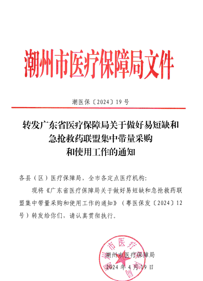 【潮州】潮医保〔2024〕19 号 转发广东省医疗保障局关于做好易短缺和急抢救药联盟集中带量采购和使用工作的通知