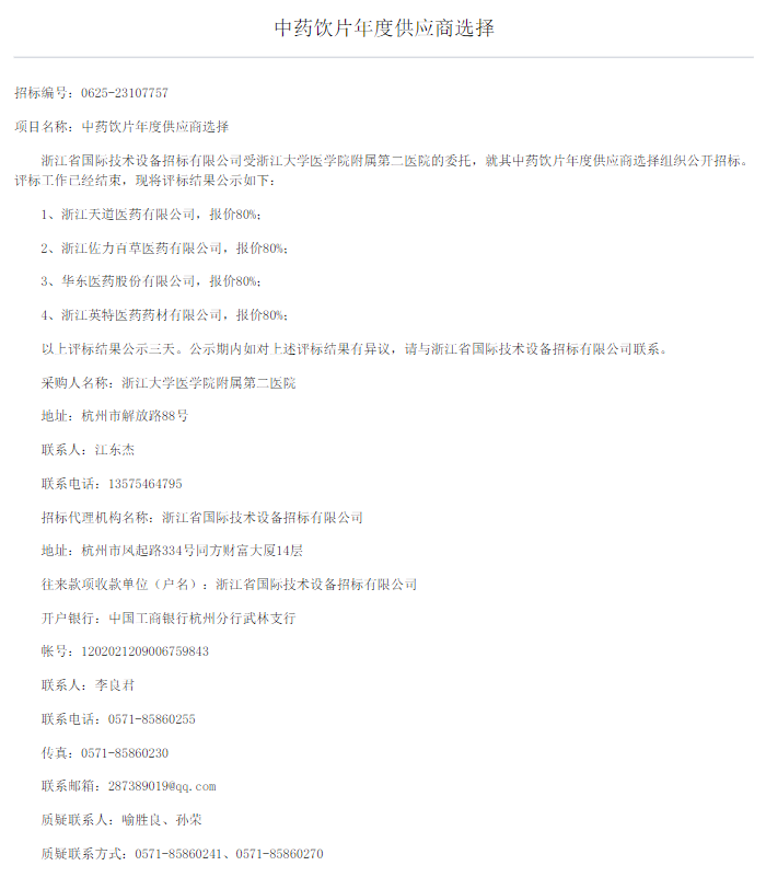【浙江大学医学院附属第二医院】浙江大学医学院附属第二医院中药饮片年度供应商选择招标结果公告