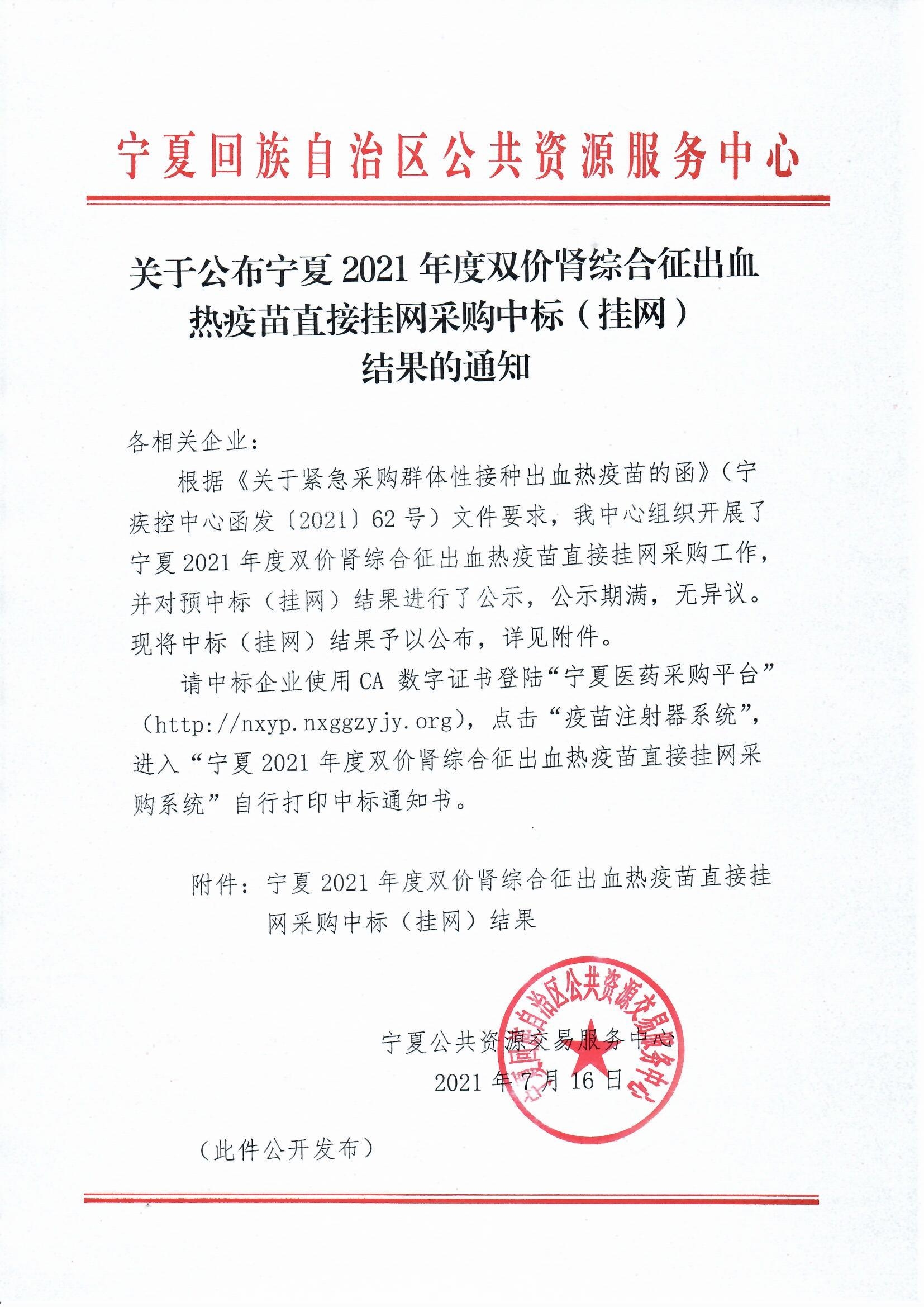 【宁夏】2021年宁夏自治区关于公布宁夏2021年度双价肾综合征出血热疫苗直接挂网采购中标(挂网)结果的通知