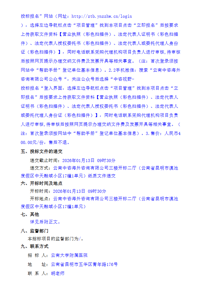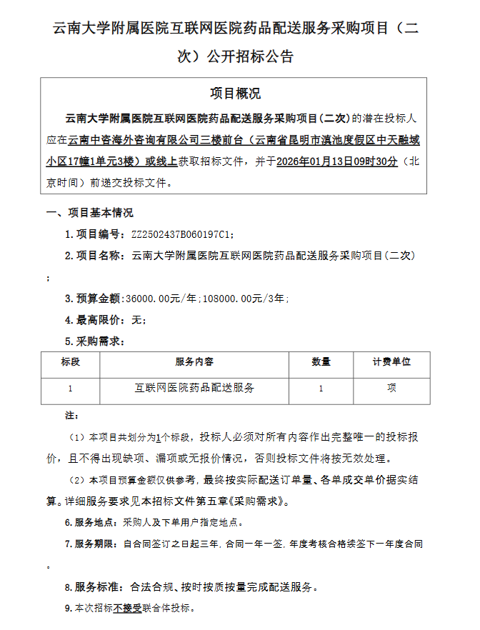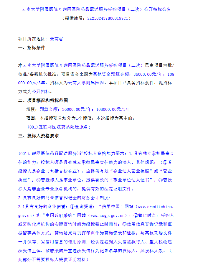 【云南大学附属医院】云南大学附属医院互联网医院药品配送服务采购项目(二次)公开招标公告