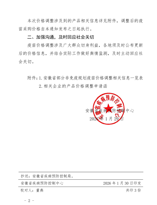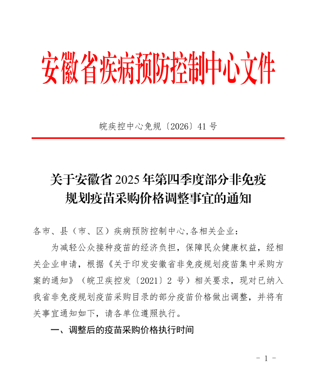 【安徽】关于安徽省2025年第四季度部分非免疫规划疫苗采购价格调整事宜的通知