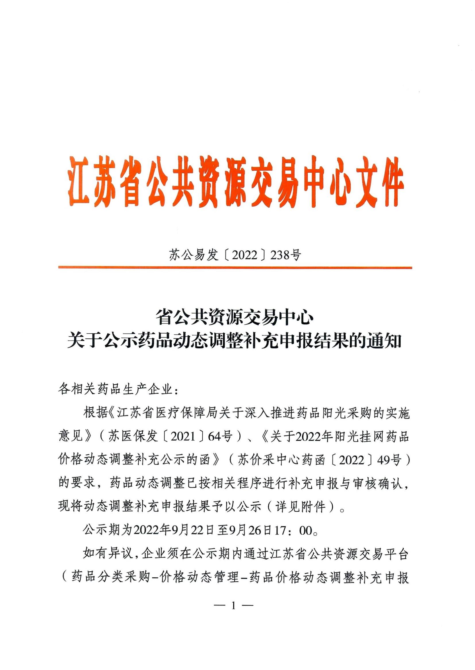 【江苏】省公共资源交易中心关于公示药品动态调整补充申报结果的通知