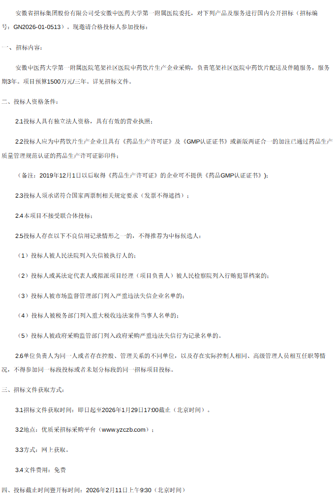 【安徽中医药大学第一附属医院】安徽中医药大学第一附属医院笔架社区医院中药饮片生产企业采购招标公告