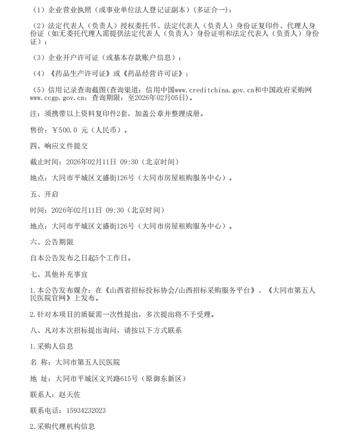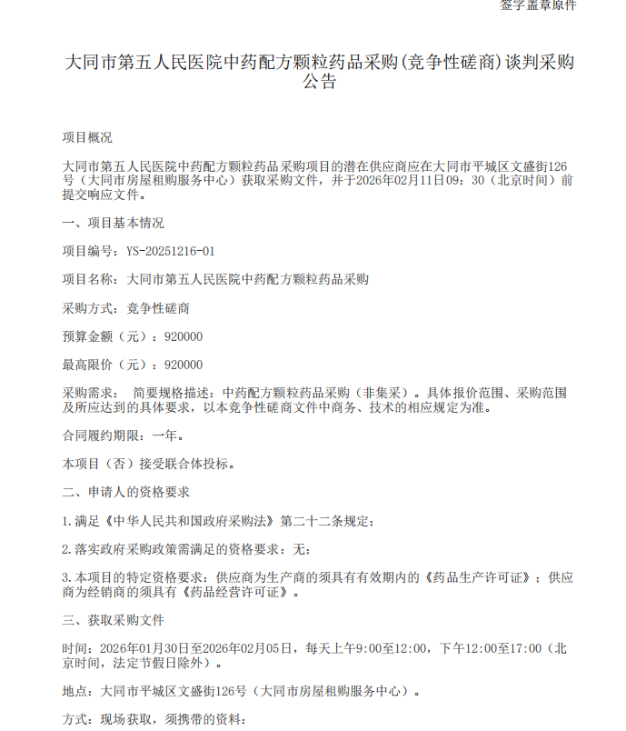 【大同市第五人民医院】山西省大同市第五人民医院中药配方颗粒药品采购(竞争性磋商)谈判采购公告