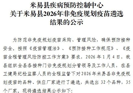 【攀枝花】2026年度米易县非免疫规划疫苗品种及供应厂家遴选结果