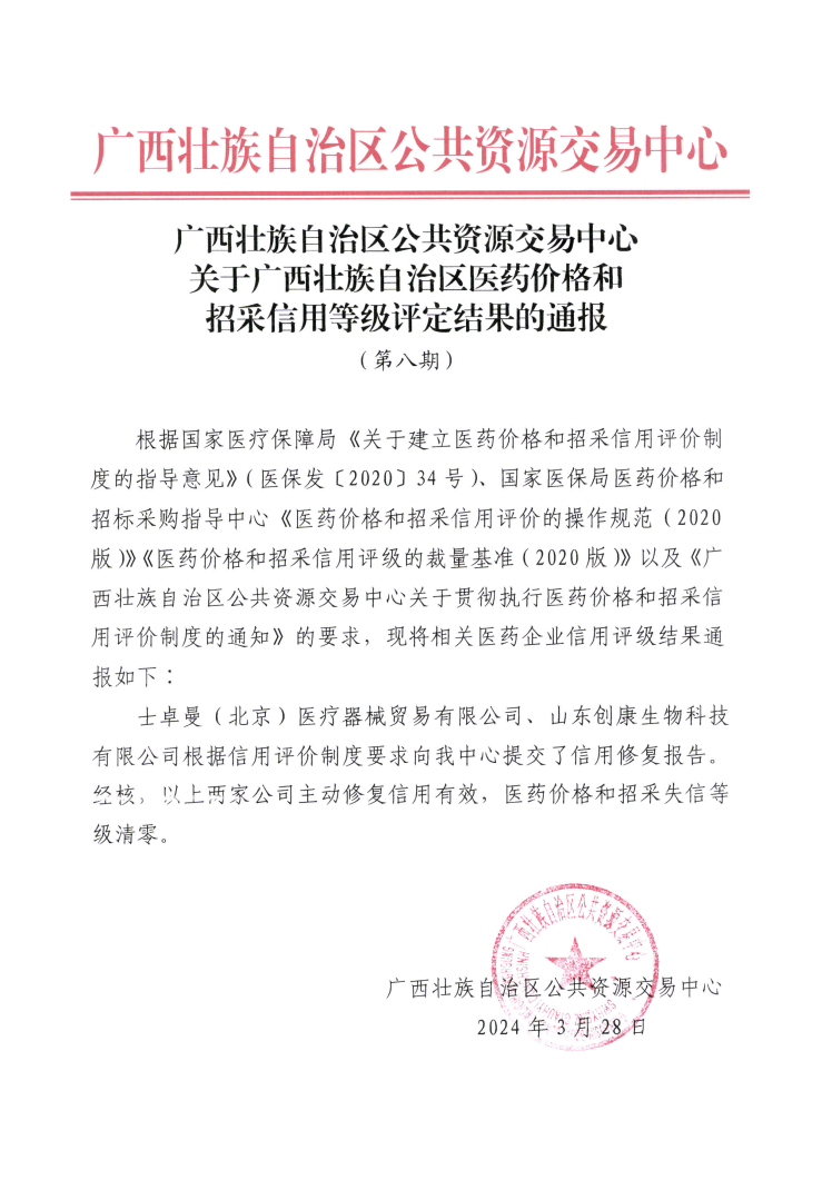 【广西】广西壮族自治区公共资源交易中心关于广西壮族自治区医药价格和招采信用等级评定结果的通报(第八期)