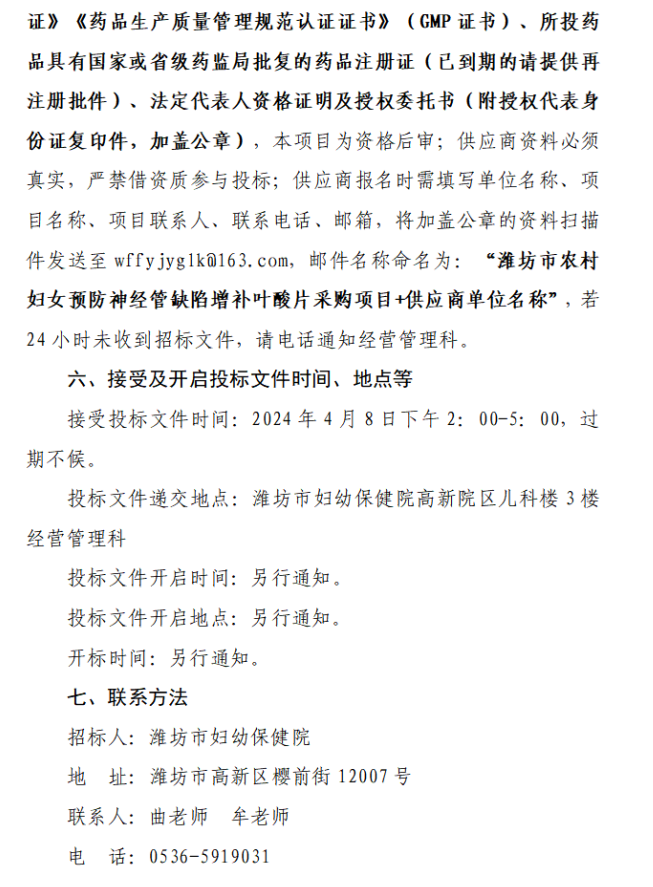 【潍坊市妇幼保健院】山东省潍坊市农村妇女预防神经管缺陷增补叶酸片采购项目招标二次公告