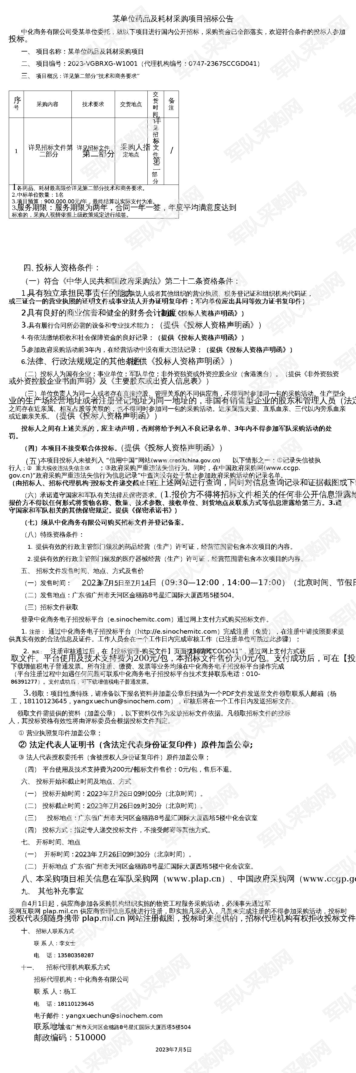 【军队采购】军队采购网某单位药品及耗材采购项目招标公告2023-VGBRXG-W1001(20230705)