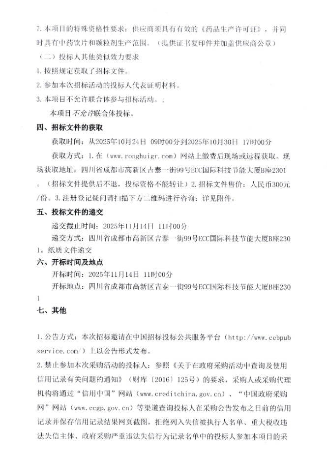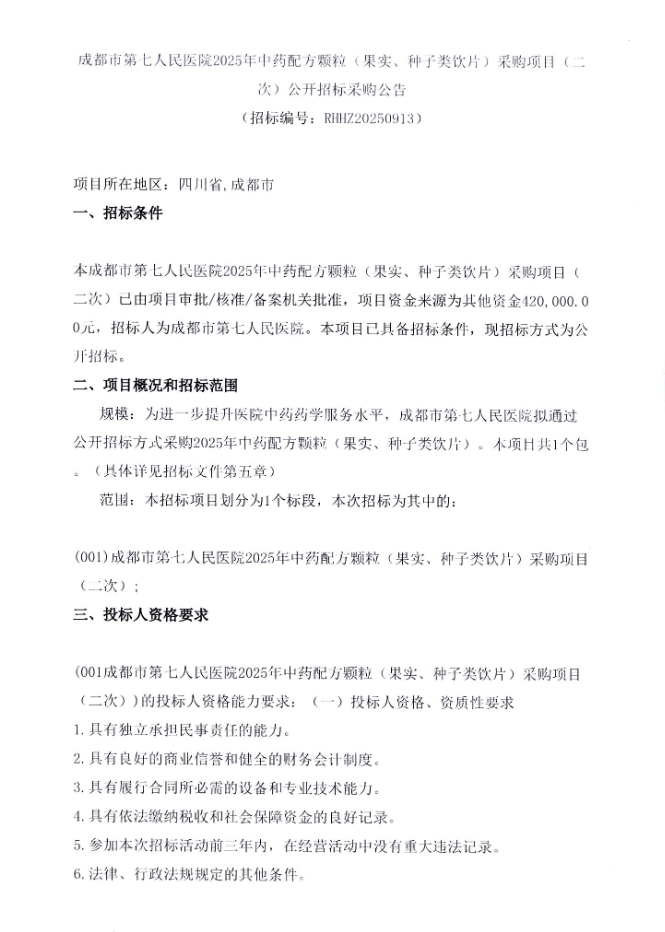 【成都市第七人民医院】四川省成都市第七人民医院2025年中药配方颗粒(果实、种子类饮片)采购项目(二次)公开招标采购公告