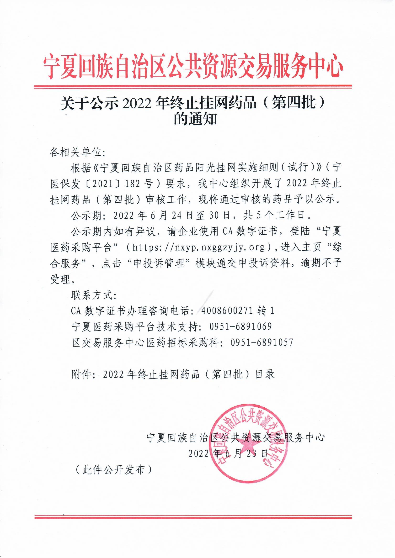 【宁夏】关于公示2022年终止挂网药品(第四批)的通知