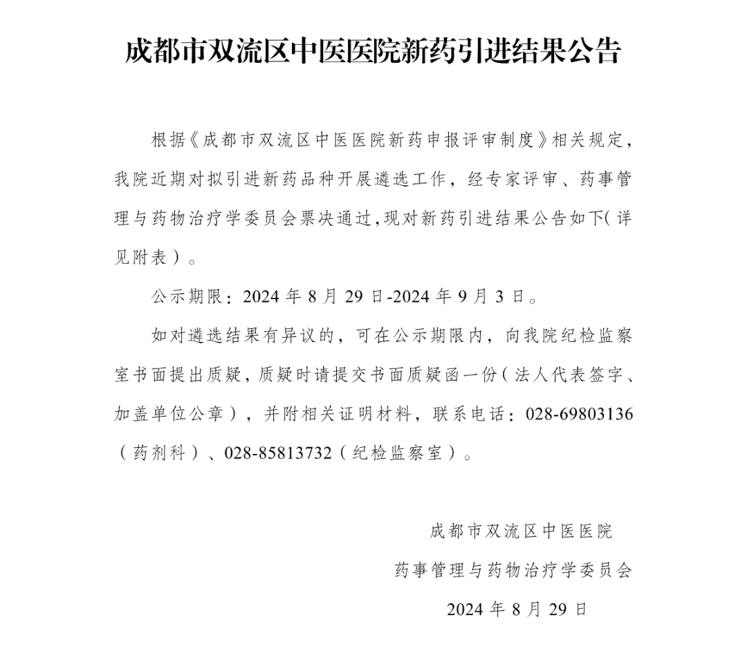 【成都市双流区中医医院】四川省成都市双流区中医医院新药引进结果公告