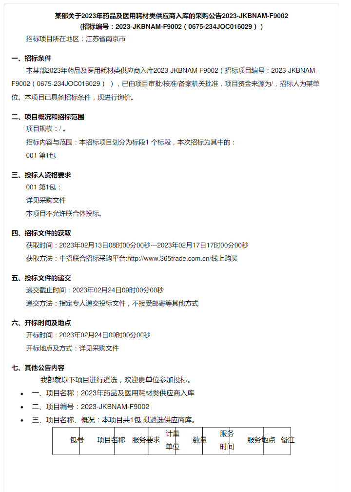 【南京市某部】江苏省南京市某部关于2023年药品及医用耗材类供应商入库的采购公告2023-JKBNAM-F9002