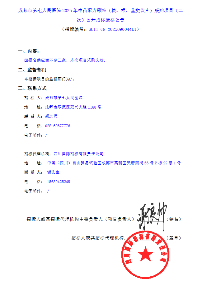 【成都市第七人民医院】四川省成都市第七人民医院2025年中药配方颗粒(块、根、茎类饮片)采购项目(二次)公开招标废标公告