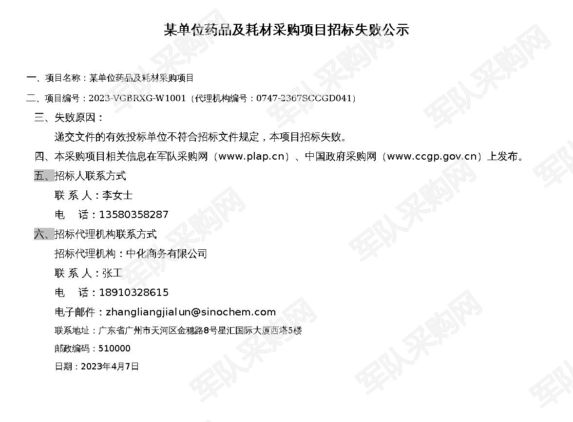 【军队采购】军队采购网某单位药品及耗材采购项目采购公告2023-VGBRXG-W1001(20230407)